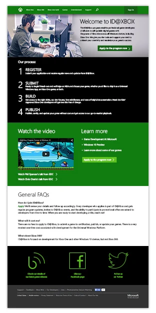 The ID@Xbox program enables independent game developers of all sizes to self-publish games on Xbox One and Windows 10. Unfortunately, the online application process was confusing, and was deterring developers from applying to and engaging with the program. Microsoft engaged MediaPlant to overhaul the appearance and functionality of the program site. MediaPlant completely changed the UI and design of the application forms to make them engaging and easy to understand for users worldwide, across all devices from desktops and laptops to tablets and phones, and in Japanese and Chinese as well as English. We also redesigned the program’s informational web pages on Xbox.com, to give them a unique gamer flavor while meshing with the overall brand, and making them responsive for all mobile devices. On the back end we carried out substantial updates to the CRM and Azure hosting to eliminate issues that had been severely hampering administration of the program.