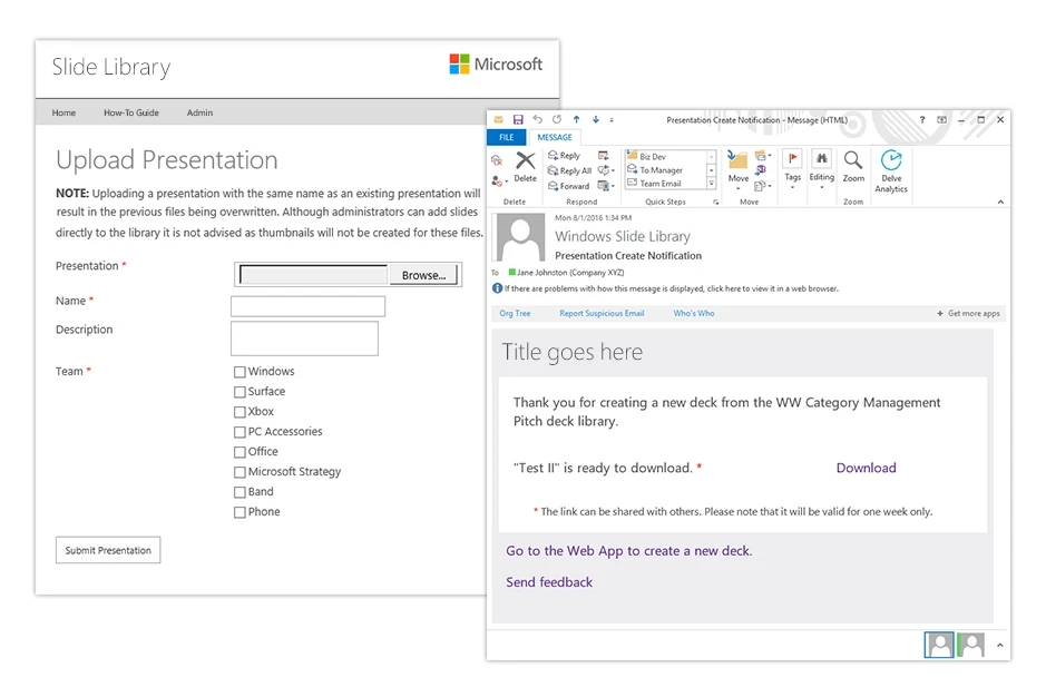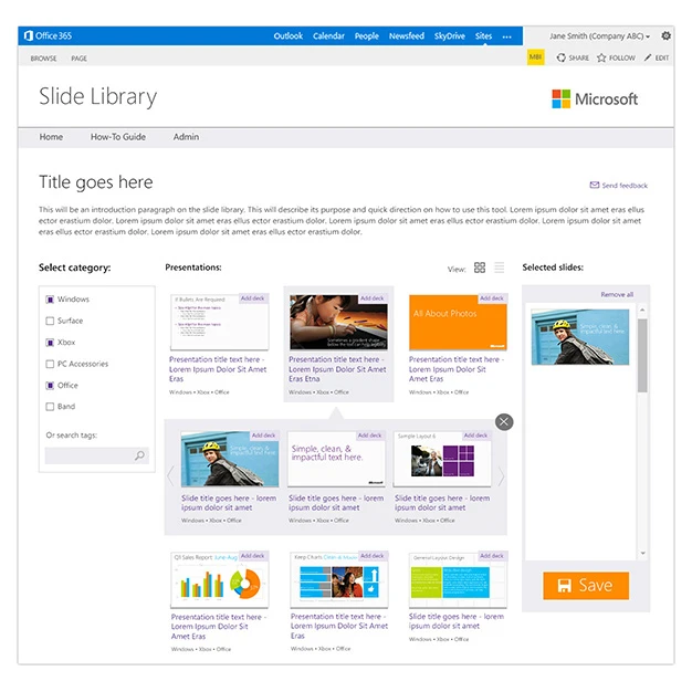 A team at Microsoft was using an outdated feature from an older version of SharePoint to house a library of PowerPoint slides. The library was heavily used by the team to create pitch decks (presentations), but the technology it was built on had been deprecated and was no longer supported in newer versions of SharePoint, prohibiting the team from making upgrades or improvements to the tool. To address the team’s needs, MediaPlant architected and developed a brand new custom SharePoint app. The new app replaced the outdated tool and provided added functionality, better usability, and the ability to be modified going forward. Via the app, PowerPoint decks are uploaded to the SharePoint library with each slide being given tags and descriptions. When team members need a pitch deck they can search the slide library using the app's easily navigated user interface, which includes the ability to filter by category, scroll through decks, preview slides, and switch between list and thumbnail views. Slides (or whole decks) can be selected with a button click and sorted into order before being exported out as a new PowerPoint deck. The new solution is more robust than the original, while still being familiar enough for the team to start using right away.