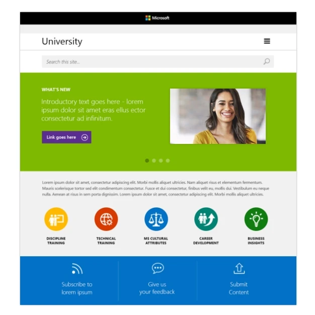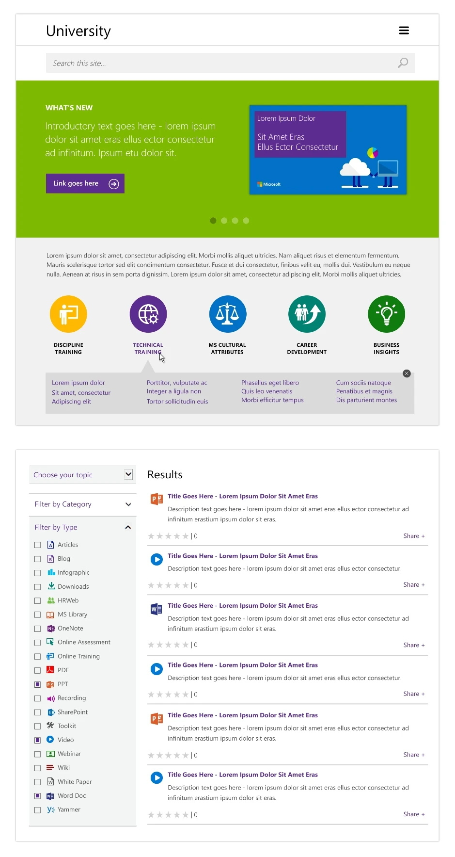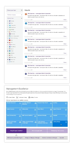 A large engineering organization at Microsoft needed help with their internal "university" portal. With a significant amount of resources aimed at helping employees improve technical skills, develop and grow their careers, stay up to date on the latest organization news, and build overall business knowledge, the site was overwhelming, difficult to use, and had an outdated UI. MediaPlant was engaged to overhaul the content structure and navigation to make it easy for users to find relevant information. MediaPlant refreshed the overall site look and feel and UI to make it more compelling and engaging, architected a new, simple structure for organizing and categorizing content, developed custom filtering tools to surface relevant content, and implemented a simple, easy-to-manage permissions structure.