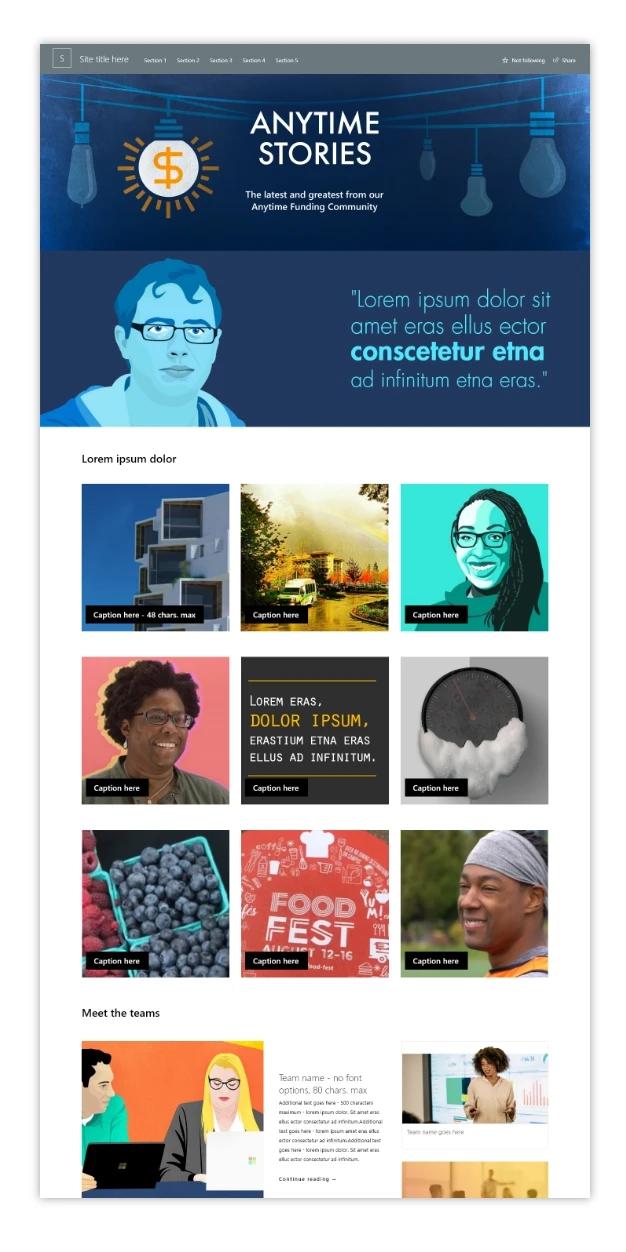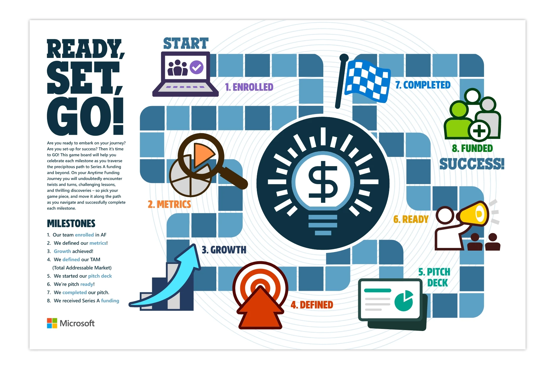 Microsoft’s Anytime Funding is an incubator program that enables employees to pitch new products to senior leadership and earn project funding if their idea is accepted. The Anytime Stories site was created to promote the program as well as to inspire an innovation mindset among Microsoft employees. Each Anytime Funding incubation team’s progress is documented—from initial concept to product launch—allowing the entire company to follow—in real-time—the highs and lows of their innovation journey. MediaPlant developed a unique visual style for the site, pushing the boundaries of SharePoint Online to deliver attention-grabbing graphics and compelling page layouts to capture interest and maintain enthusiasm. Featured site content includes team mission statements, pitch decks, member spotlights, and project “snapshot” videos, as well as a podcast program and an ongoing series of virtual meetups. We also created fun motivational tools for the Anytime Funding teams, including a retro-styled game board that allows them to track their progress through key project milestones.