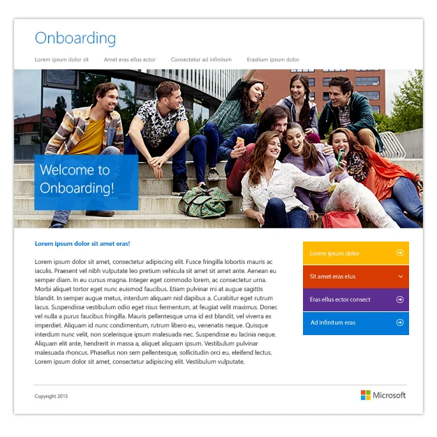Microsoft engaged MediaPlant to build an onboarding playbook for new employees. Rather than sticking with the status-quo and building off of the solution the team had been using in the past, MediaPlant recommended turning the messy, error-prone onboarding tool into a polished, professional SharePoint site instead. We were able to replicate the core look and tabbed functionality and navigation that the team was accustomed to while providing a more robust back-end to support better reliability and performance, as well as easier, more manageable updates.