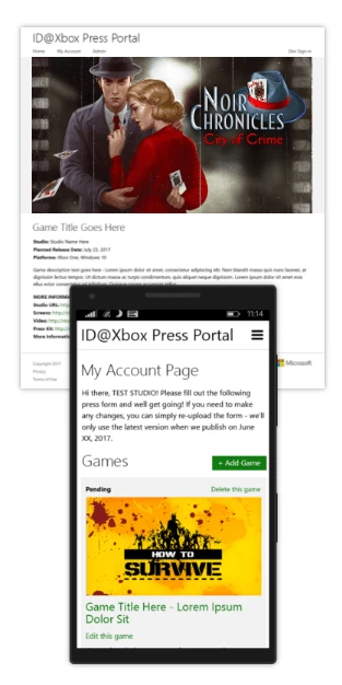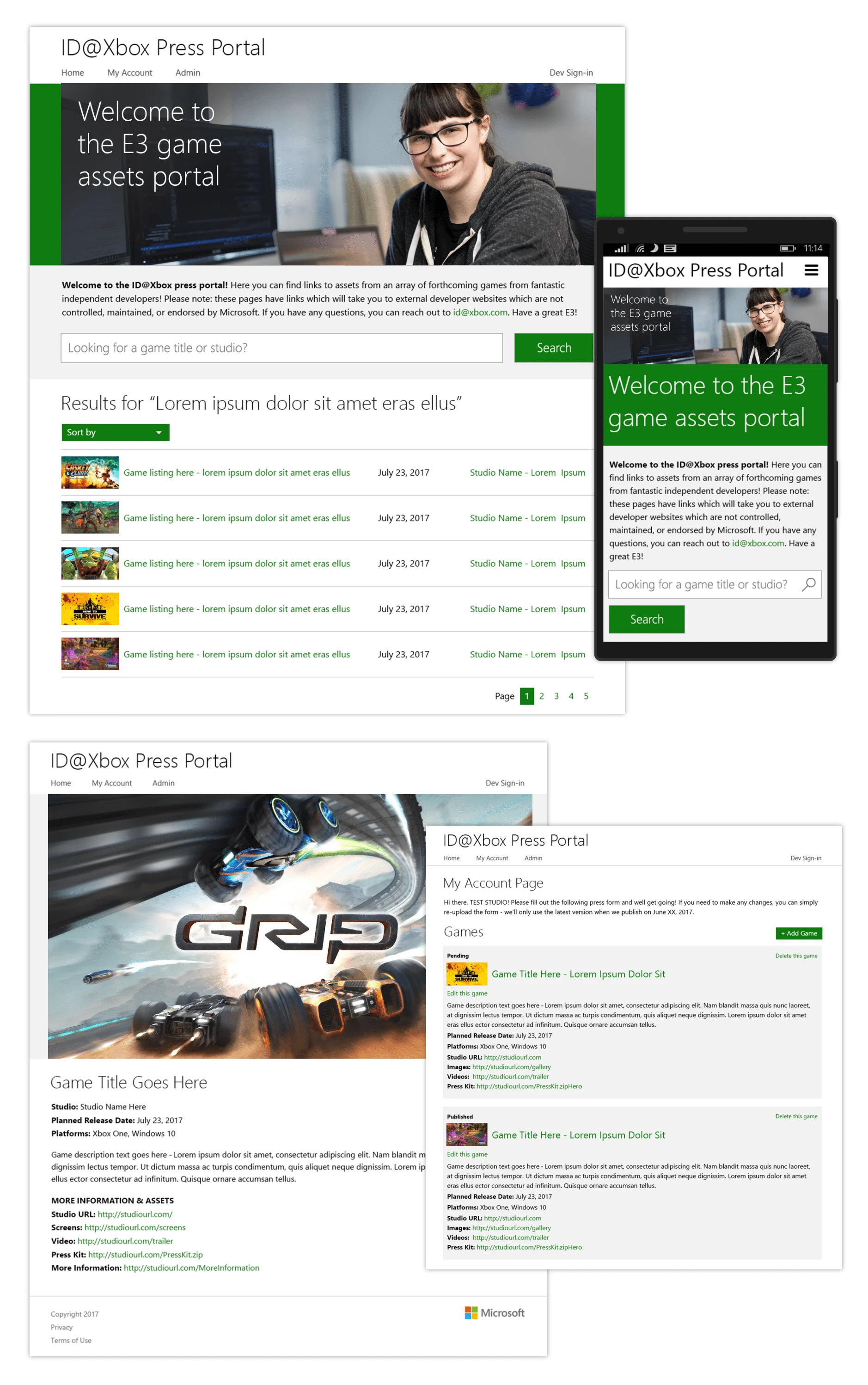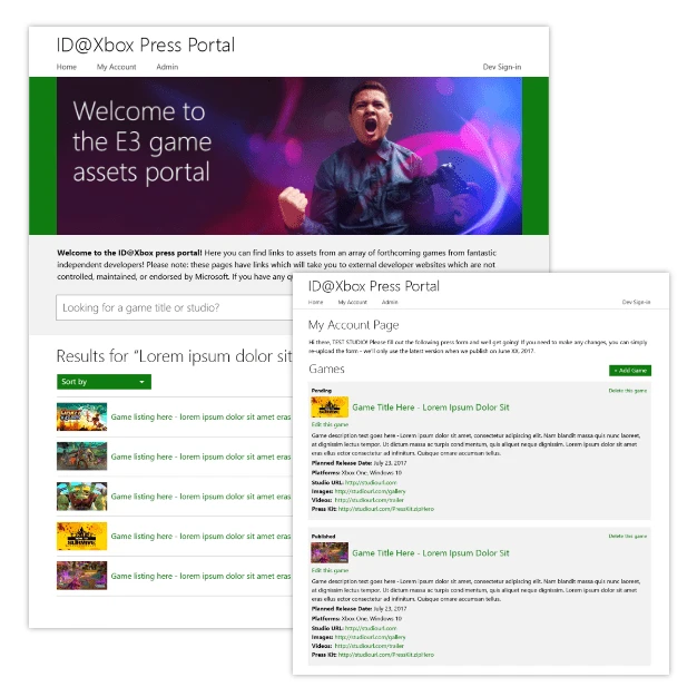 The ID@Xbox team engaged MediaPlant to create a self-service portal to support the program’s independent game developers by enabling them to promote upcoming releases during premier events like E3. The portal allows studios to upload game information, related assets and other promotional materials, which are vetted by a site admin and then published in a searchable format to facilitate press access. Hosted on Azure, the site includes an admin dashboard for reviewing and publishing uploaded game information as well as a secure page for studios to upload, review, and edit their information. Search functionality and game profile pages are primarily used onsite at the event center, so the site is optimized in anticipation of slow event wi-fi. The portal is refreshed for each new event through the year, with previously uploaded games stored in searchable archives.